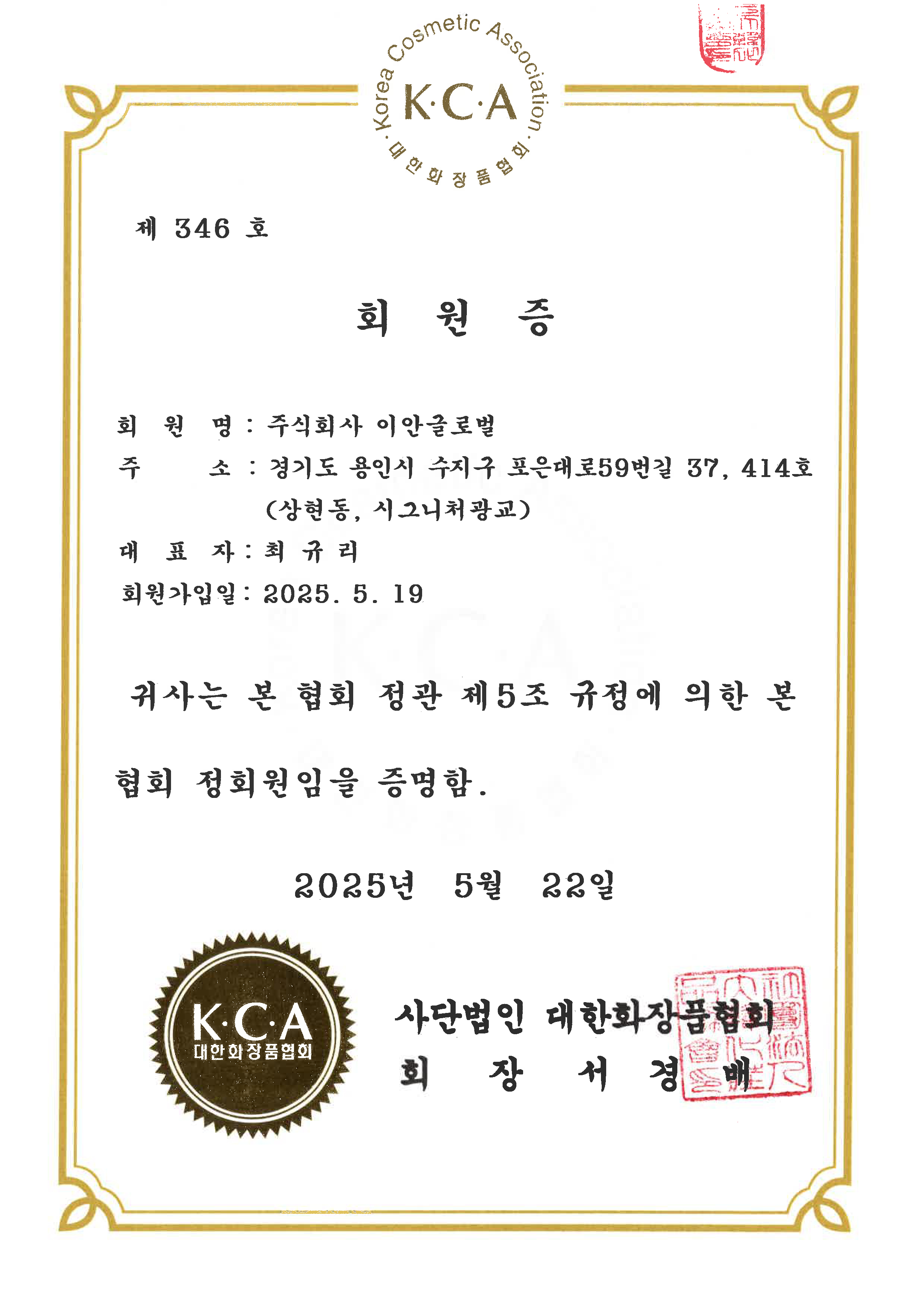 이안글로벌은 최근 대한화장품협회 정회원사로 공식 등록을 완료하였습니다.